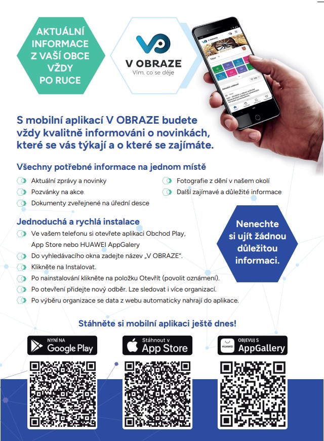 Obec zajistila snadný a rychlý způsob, jak mít aktuální informace z naší obce ve vašem mobilním telefonu. Stačí si zdarma nainstalovat mobilní aplikaci V OBRAZE