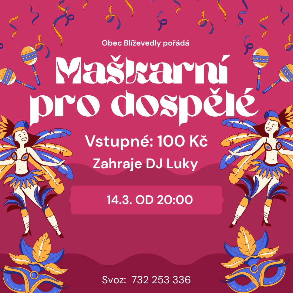 Obec Blíževedly vás zve 14.3.2026 na maškarní pro dospělé od 20:00 do KD Blíževedlích